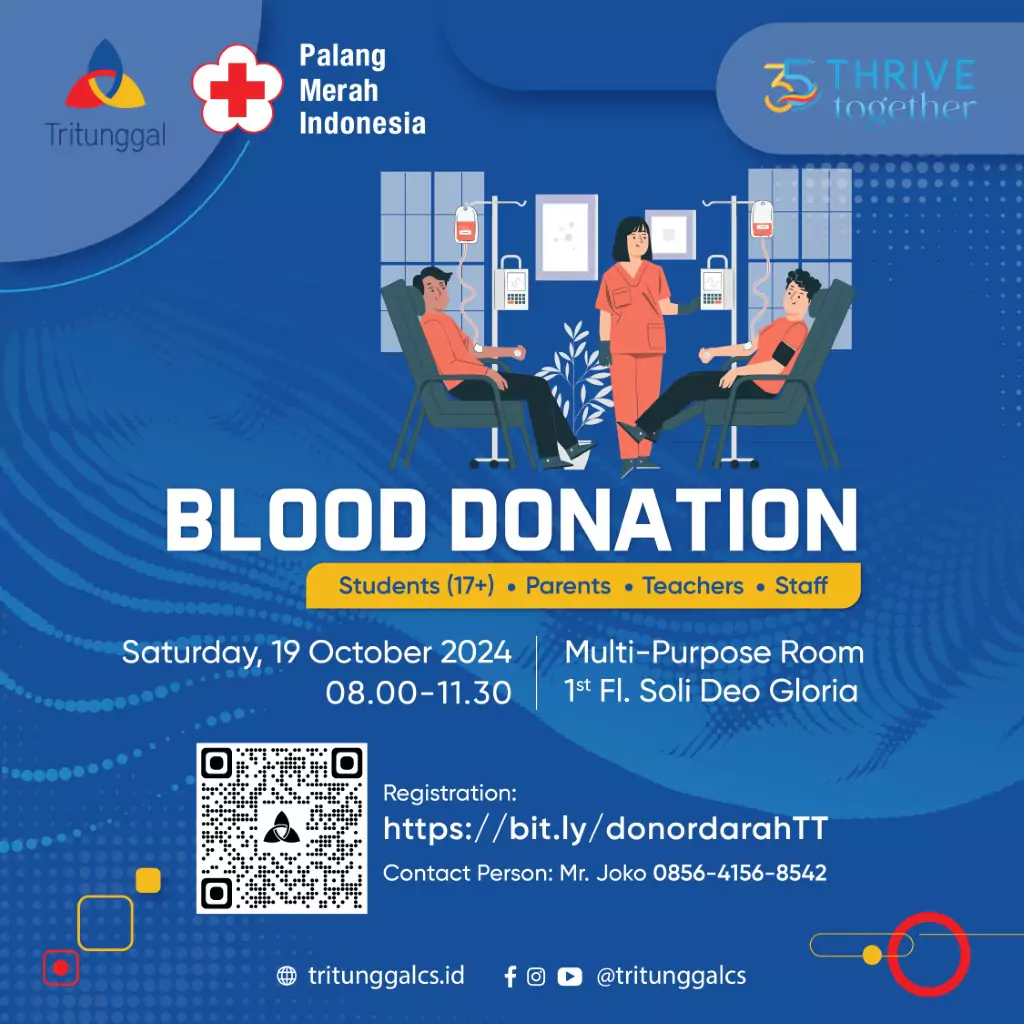 Masih dalam rangkaian HUT ke-35, Sekolah Kristen Tritunggal bekerjasama dengan PMI Kota Semarang kembali mengadakan kegiatan Donor Darah pada: 🗓️ : Sabtu, 19 Oktober 2024⏱️ : Pk. 08.00-11.30🏛️ : Multi-Purpose RoomGd. Soli Deo Gloria Lt. 1Jl. Semarang Indah Blok F/1Semarang…