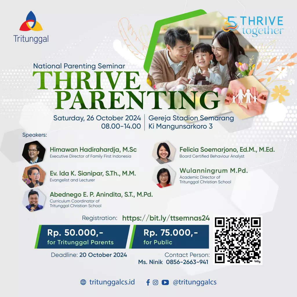 Dalam rangka perayaan HUT ke-35 Sekolah Kristen Tritunggal mempersembahkanSeminar Nasional Parenting 2024 dengan tajuk “Thrive Parenting”.🗓️ : Sabtu, 26 Oktober 2024⏱️ : Pk. 08.00 – 14.00 WIB🏛️ : Gereja Stadion Jl. Ki Mangunsarkoro No. 3, Semarang Sebuah seminar yang akan…