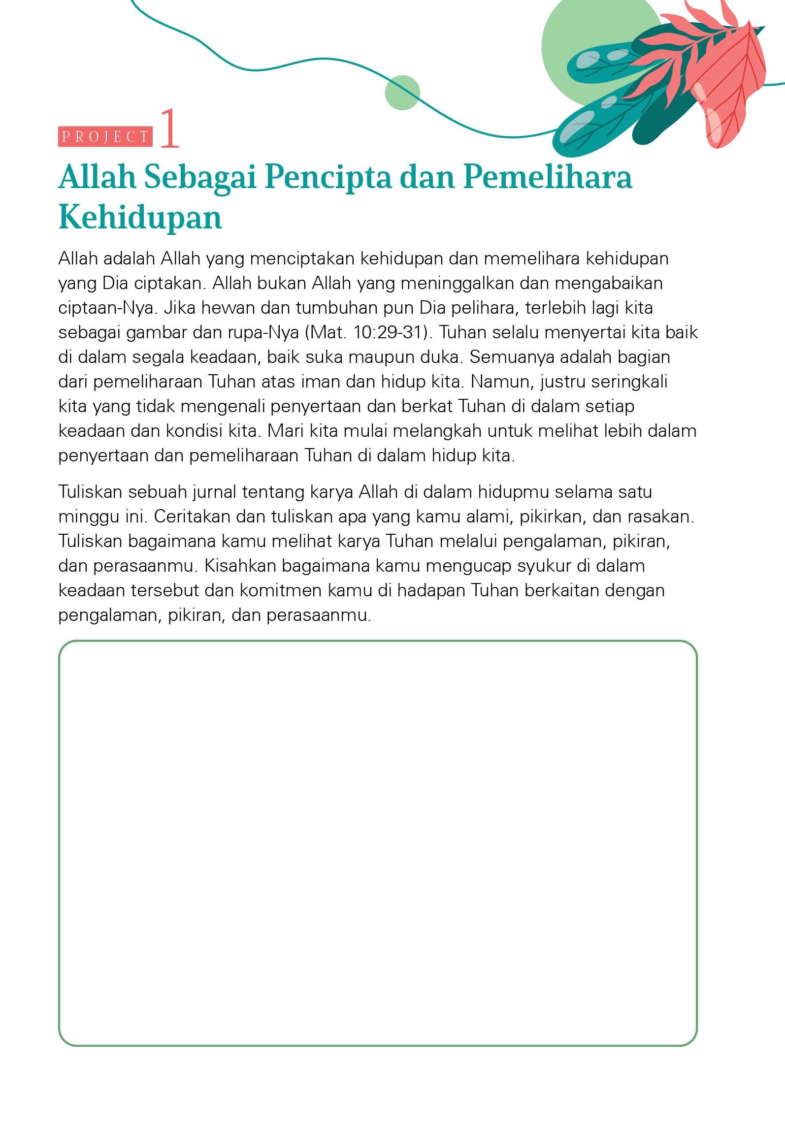 Tuliskan sebuah jurnal tentang karya Allah di dalam hidupmu selama satu minggu ini. Ceritakan dan tuliskan apa yang kamu alami, pikirkan, dan rasakan. Tuliskan bagaimana kamu melihat karya Tuhan melalui pengalaman, pikiran, dan perasaanmu. Kisahkan bagaimana kamu mengucap syukur di dalam keadaan tersebut dan komitmen kamu di hadapan Tuhan berkaitan dengan pengalaman, pikiran, dan perasaanmu.